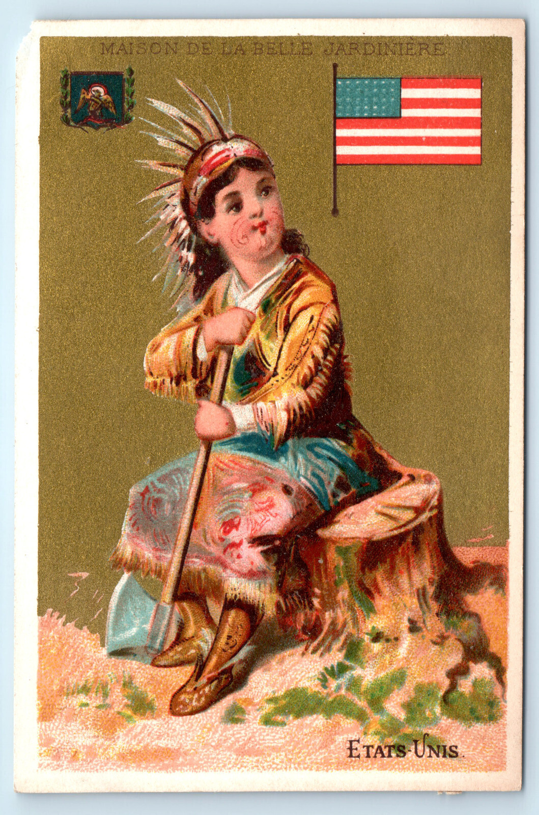 American Flag Indian Princess Axe Map On Back Victorian Trade Card