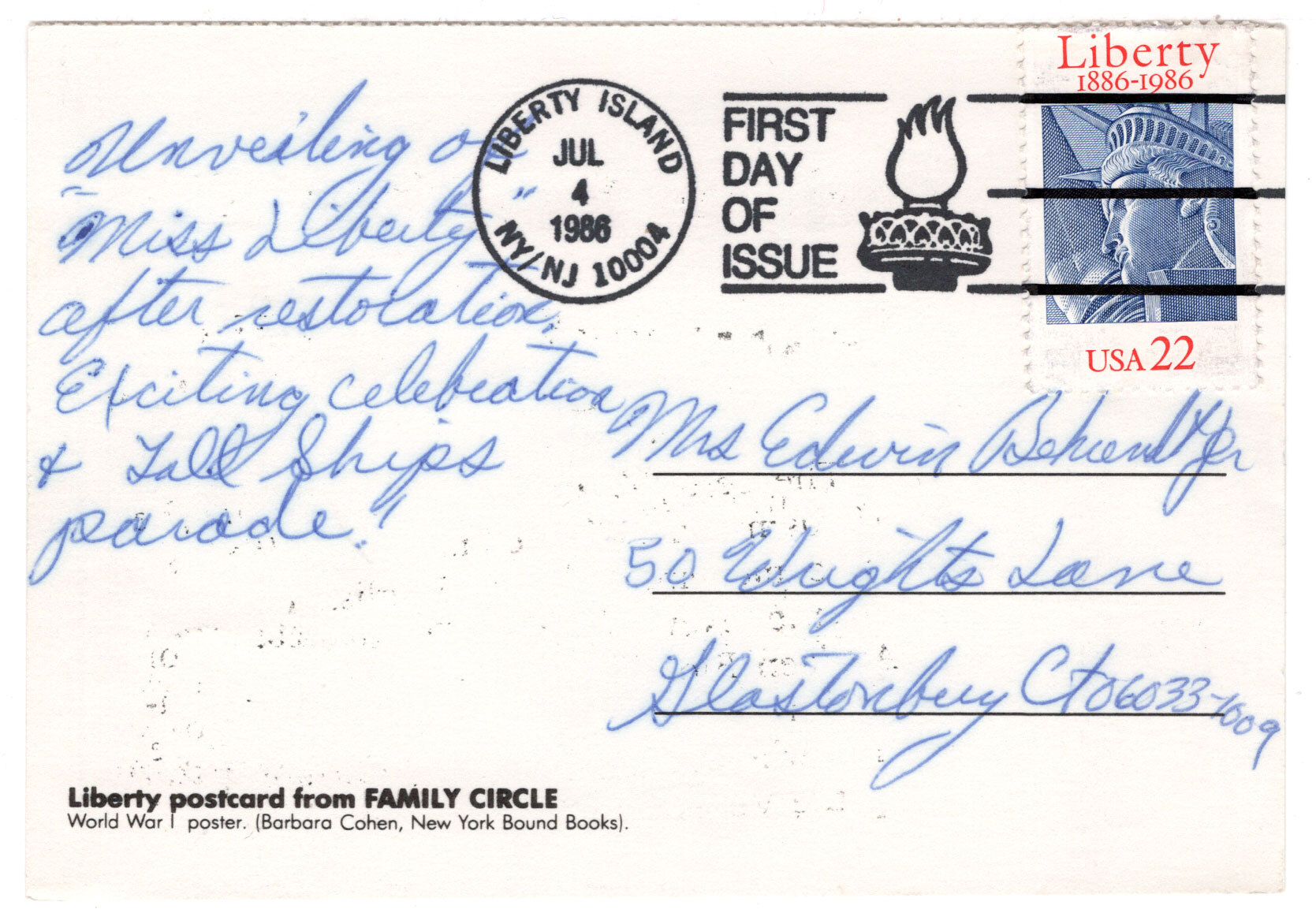 Liberty Postcard from Family Circle - First Day of Issue. Postcards are shown from Actual Scan - Post Marked July 4, 1986 in Very Good Condition..