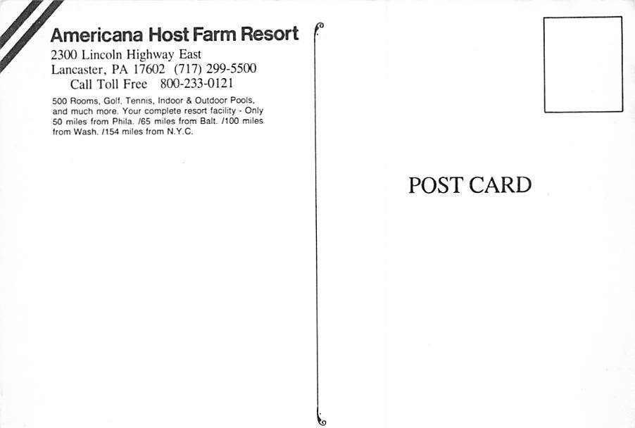 Americana Host Farm Resort , Pennsylvania Postcard Grade: 1 Size: Continental Size - approximatly 4 Inch x 6 Inch (15 cm x 10.5) Grading Scale: Grade 1 = Perfect corners Grade 2 = Very Minimal corner wear, no ... Read More