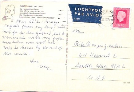 Beautiful postcard showing one of the many locks. Netherlands 40 cent stamp. Sent to Seattle, Washington. 1975