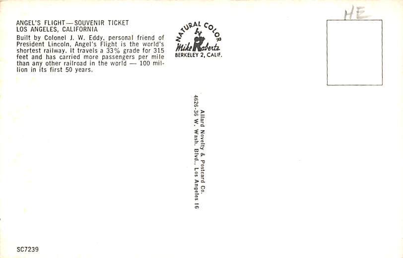 Angel's Flight-Souvenir Ticket Los Angeles CA Postcard - Unused Grade: 3 Size: R - Regular size: Approx 3 1/2 X 5 1/2 inch (9 cm X 14 cm) Grading Scale: Grade 1 = Perfect corners Grade 2 = Very Minimal corner ... Read More
