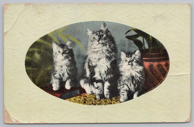 Animal~3 Gray Kittens On Table~Vintage Postcard