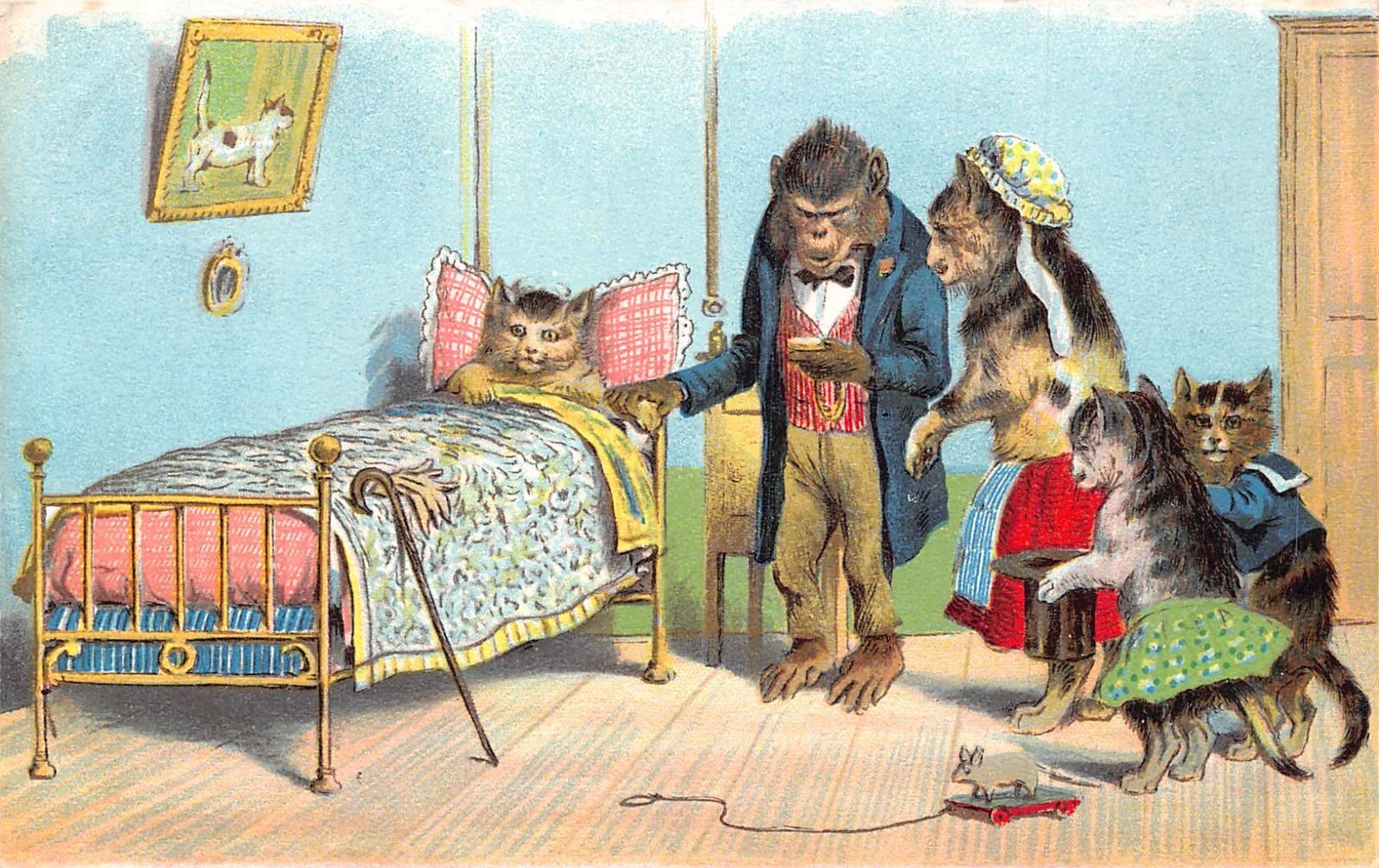 Animals Anthropomorphic Monkey Doctor Cat Ill in Bed Humanized postcard B920 This item is listed via xdm.it software