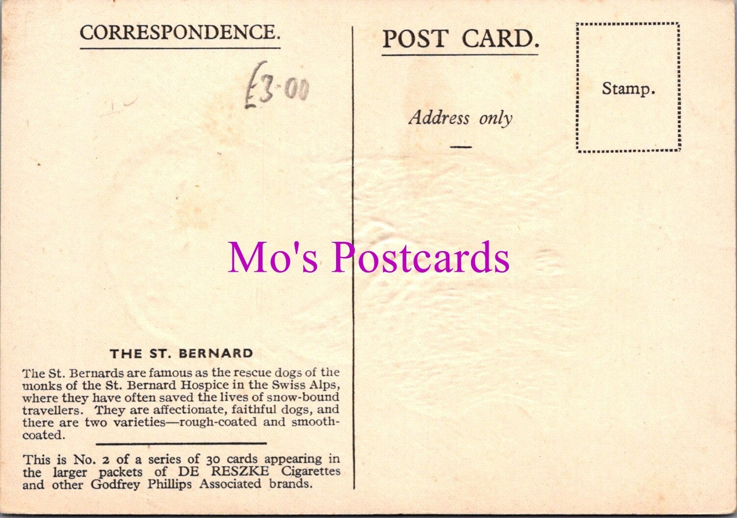 This is an Animals Postcard - Dogs, The St Bernard DZ353 Publisher: Godfrey Phillips - De Reszke Cigarettes Postcard size: Non standard. This postcard measures 89mm x 126mm Postcard defect(s): Please also use the im ... Read More