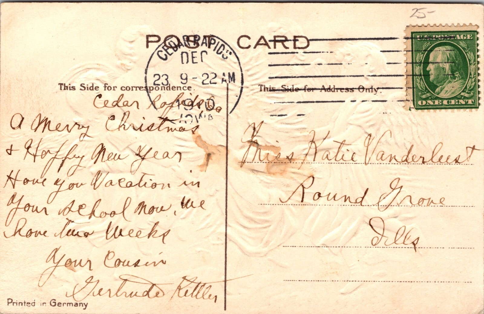 Beautiful antique embossed Christmas postcard, postmarked 1910 and printed in Germany. The richly detailed illustration features five child angels in colorful gowns holding hands and dancing in a circle around a decorated Christmas tree glowing with golden lights. Caption at bottom reads “Merry Christmas.”Publisher/Printer: EAS, Printed in GermanyDate: Postmarked Dec 23, 1910 (Cedar Rapids, IA with 1¢ Benjamin Franklin stamp)Card Type: Embossed lithograph postcardSubject: Angels, Christmas tree, winter holiday greetingCondition: Very good for age; light wear; postally used with handwritten message and address.Historical Note:German-printed postcards from the Golden Age of Postcards (c. 1905–1915) were prized for their vivid color, embossing, and artistry. Angel-themed holiday cards were especially popular during this period, symbolizing innocence, joy, and the spirit of Christmas.Perfect for collectors of:Angel postcardsGerman-printed Christmas ephemeraEmbossed Golden Age postcardsReligious and holiday-themed postcards