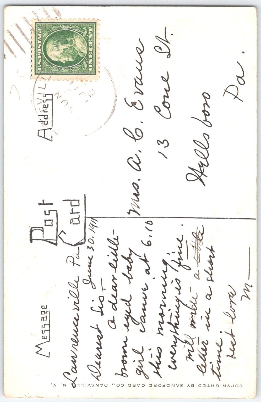 This charming antique postcard features a delicate design of cherub babies surrounding a sweet birth announcement poem. The card is embellished with gold-tone highlights and green lettering, adding a vintage elegance to the message that celebrates the arrival of a newborn. The handwritten details fill in the baby's name, age, and weight, making this a heartfelt keepsake from the early 20th century. Postmarked June 30, 1911, this postcard was produced by Sandford Card Co., Dansville, N.Y., a well-known publisher of the era. It remains a wonderful example of early 1900s paper ephemera, perfect for collectors interested in birth announcements, angelic motifs, or vintage postcards. The reverse side holds a 1-cent green U.S. postage stamp featuring Benjamin Franklin, further confirming the period authenticity. An excellent piece for those who appreciate sentimental and historical collectibles.