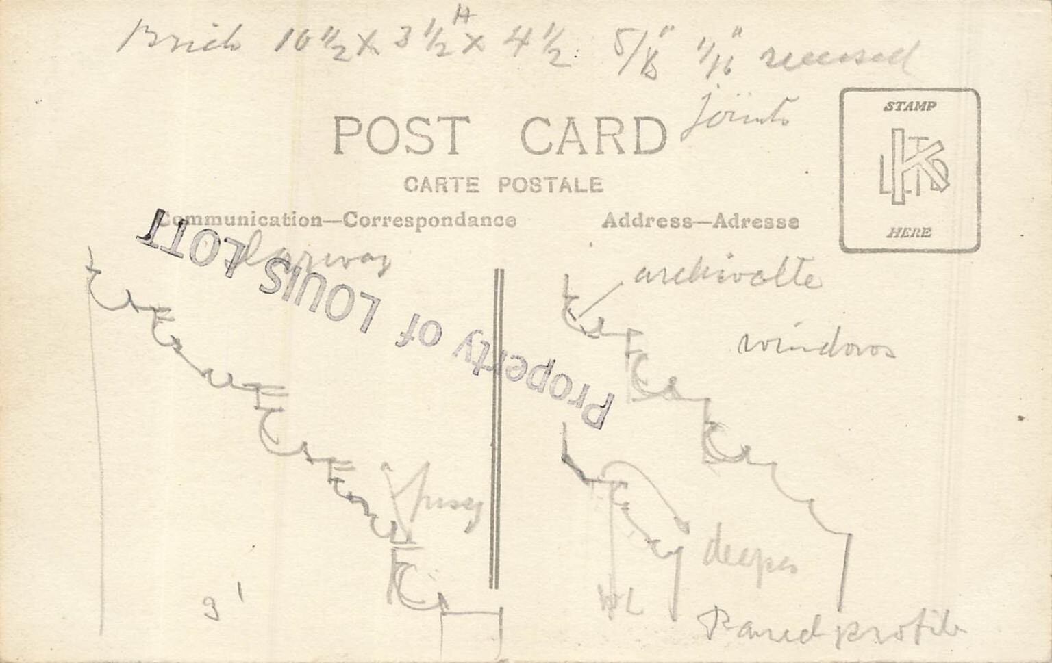 This original antique photo postcard features the iconic Roskilde Cathedral in Denmark, a masterpiece of European Gothic architecture renowned for its intricate stepped gable and historic significance. Captured in black and white, the image highlights the cathedral's detailed brickwork with recessed joints and archivolts framing the windows, showcasing architectural elements typical of Northern European medieval churches. The postcard measures the standard 5.5 x 3.5 inches typical of early 20th-century divided back cards, dating from 1907 to 1915.Produced during the divided back era, this postcard is an exceptional example of early 20th-century European architectural photography, reflecting the craftsmanship of the period. The back of the card includes handwritten architectural notes and measurements, adding a unique collectible aspect for enthusiasts of historical architecture and postcards. The printed stamp box with the initials "LK" hints at the publisher's mark, contributing to the postcard's authenticity and period charm.