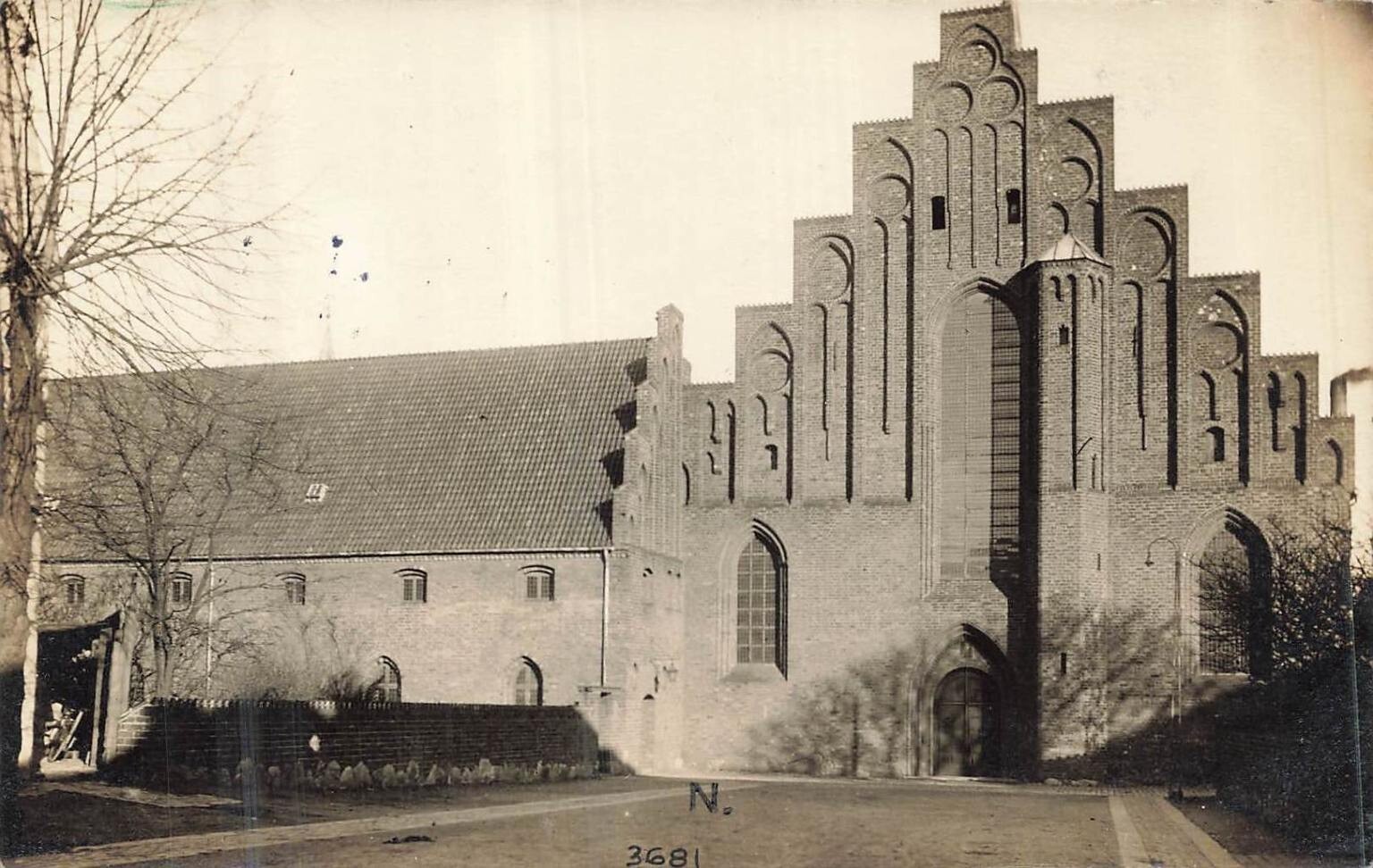 This original antique photo postcard features the iconic Roskilde Cathedral in Denmark, a masterpiece of European Gothic architecture renowned for its intricate stepped gable and historic significance. Captured in b ... Read More