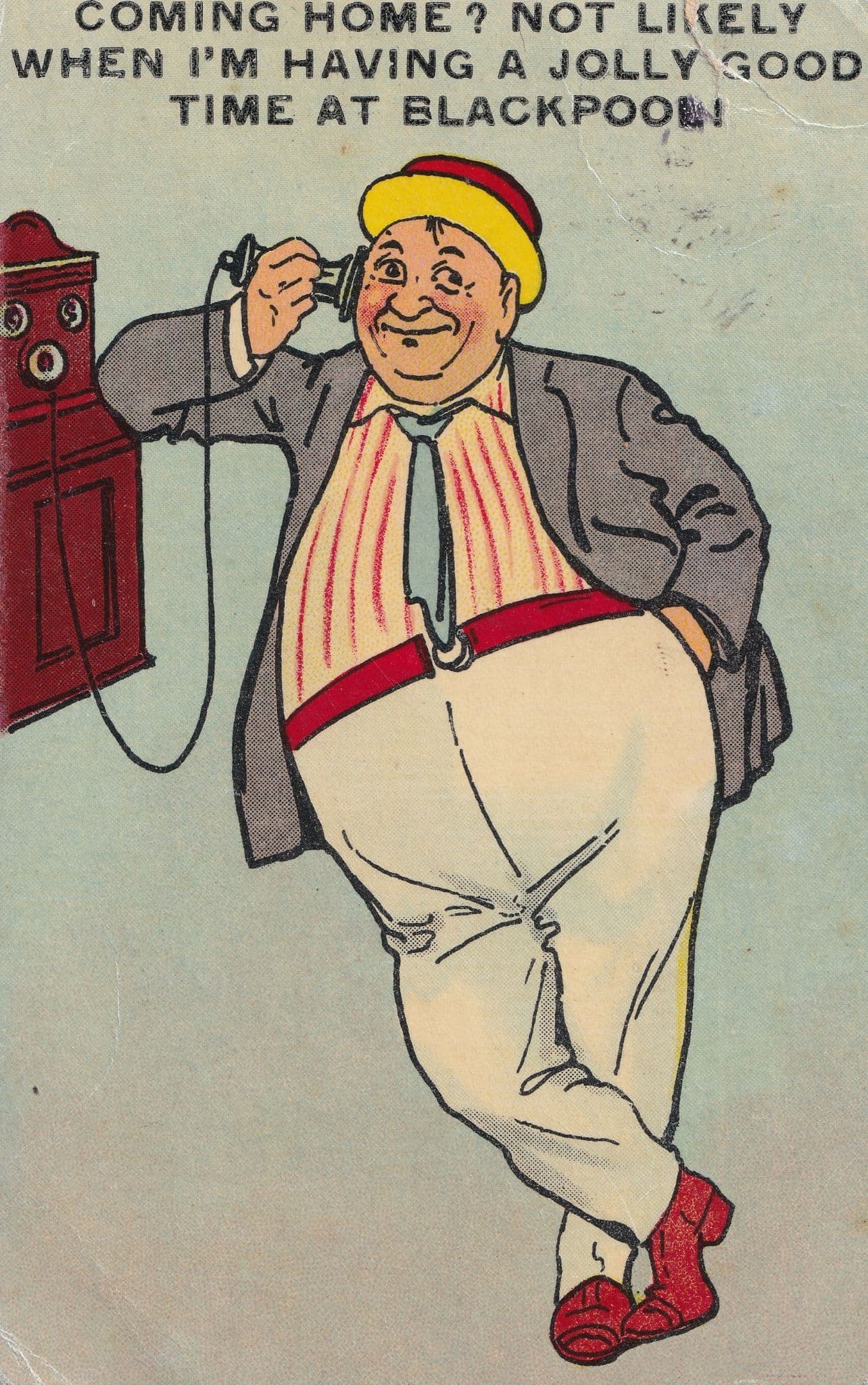 ts143 Antique postcard from the early 1900s of this old wall phone at Blackpool in this comic card from 1911 - it has top right corner indented area & lower left so please allow for these - graded otherwise good to vg - a really unique local Blackpool postcard that is a must for telephone postcard collectors too