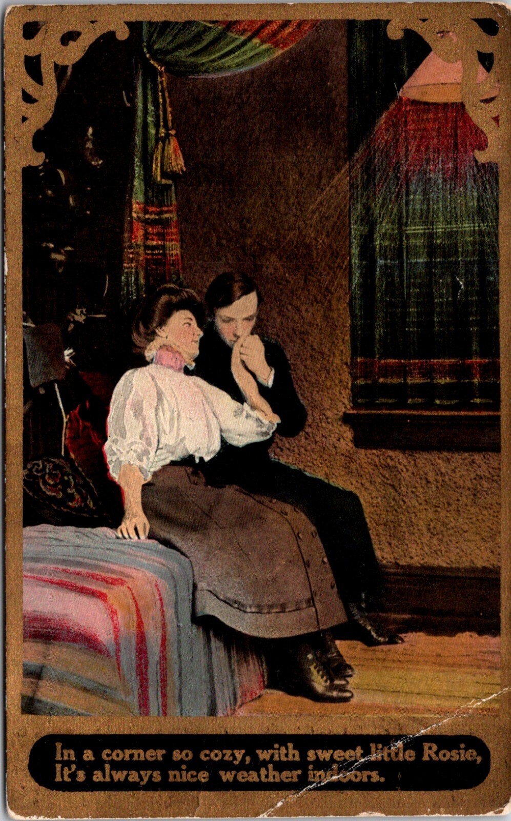 Antique Postcard Divided Back Gold Couple Man Kissing Women Hand Rosie Indoors