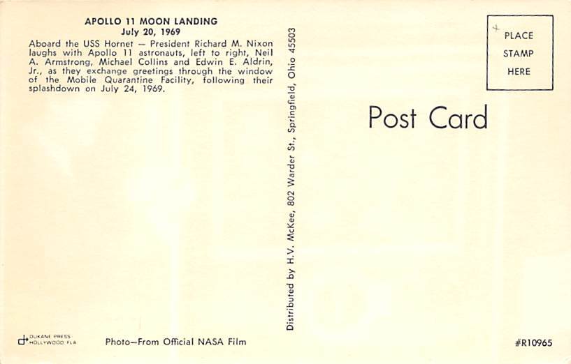 Apollo 11 moon landing Space Postcard Unused, Grade: 1, , Size: Regular size: Approx 3 1/2 X 5 1/2 inch (9 cm X 14 cm) Grading Scale: Grade 1 = Perfect corners Grade 2 = Very Minimal corner wear, no creases Gr ... Read More
