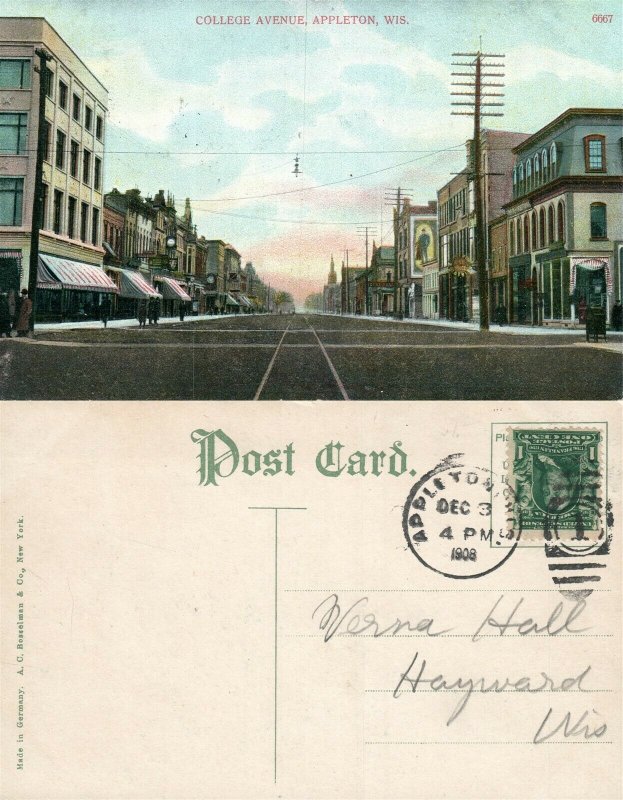 APPLETON WIS. COLLEGE AVENUE 1908 ANTIQUE POSTCARD w/ CORK CANCEL