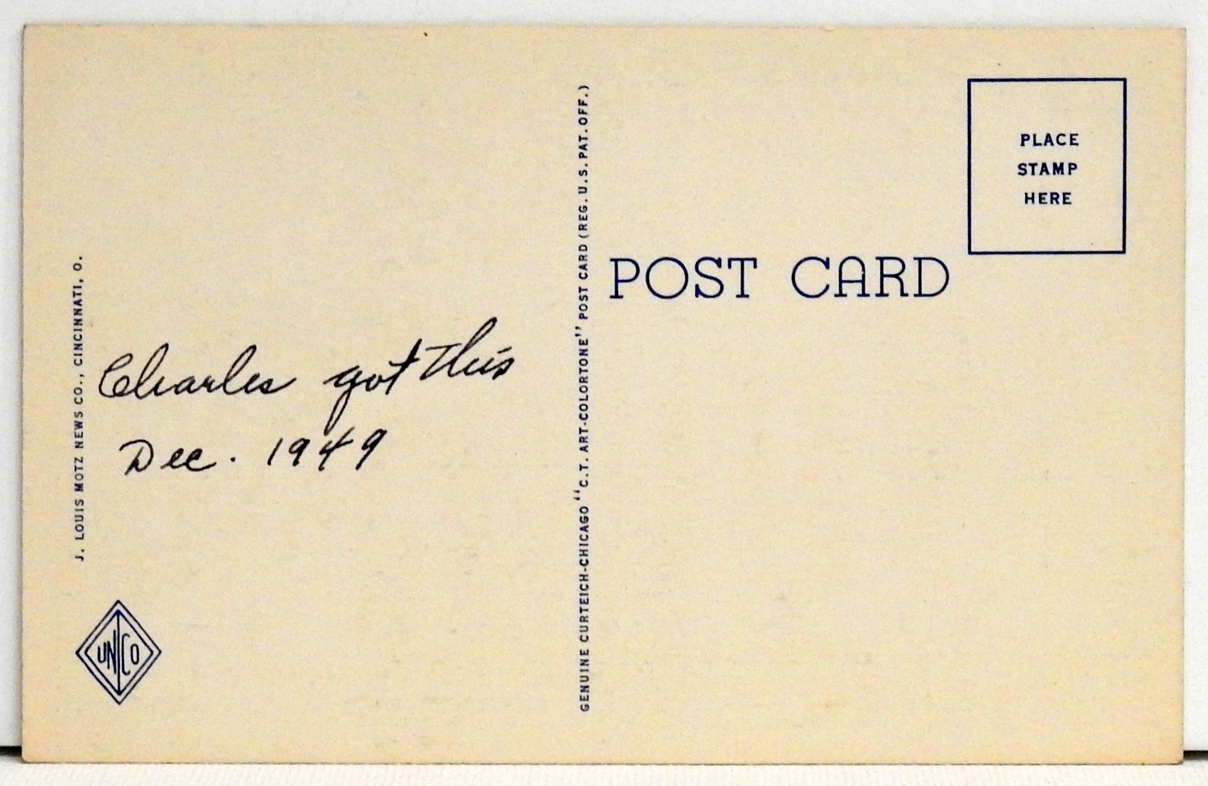 By Curt Teich for J. Louis Motz News Company of Cincinnati, Ohio. Train station.
