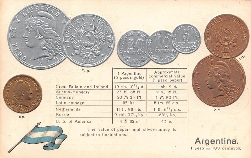 Argentina Table Exchange Flag Coins embossed coinage postcard C315