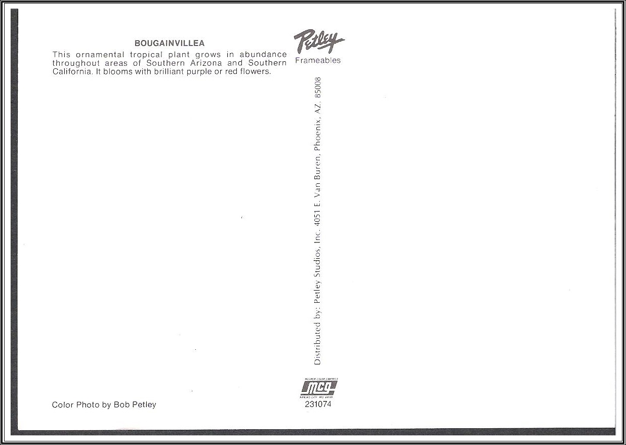 Type: Publisher: Petley Photographer: Bob Petley Description: Bougainvillea Condition: Unaddressed - Continental Size