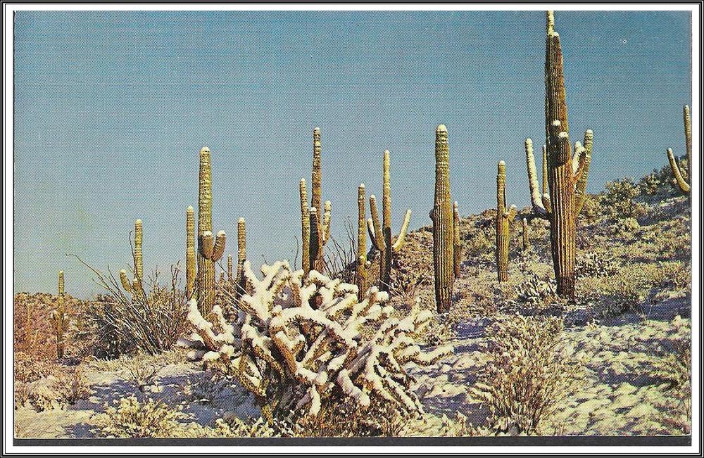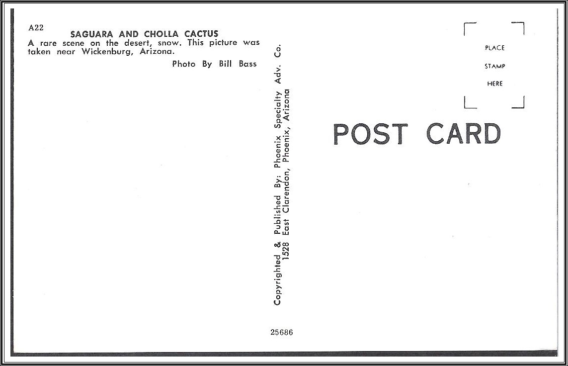 Type: Date: Publisher: Phoenix Specialty Adv. Co. Photographer: Bill Bass Description: Saguaro and Cholla Cactus in the Desert, Snow Condition: Unaddressed - Standard Size Keywords: postcard