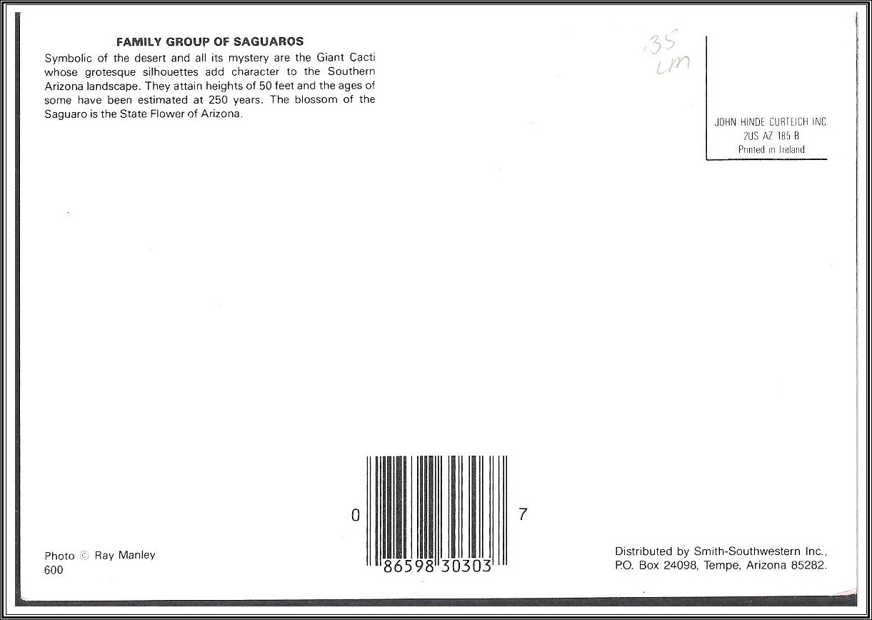 Publisher: Smith-Southwestern Photographer: Ray Manley Description: Family Group of Saguaros Condition: Unaddressed - Continental Size