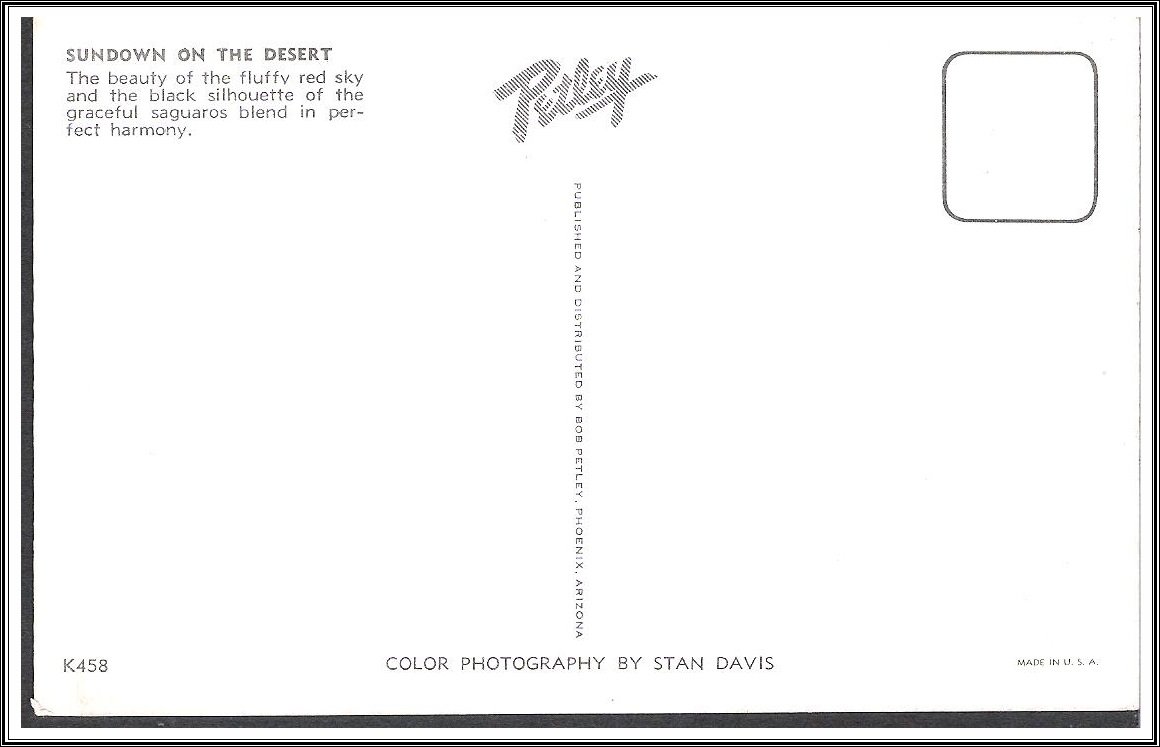 Type: Date: Publisher: Petley Photographer: Stan Davis Description: Sundown on the Desert Condition: Unaddressed - Standard Size Keywords: postcard