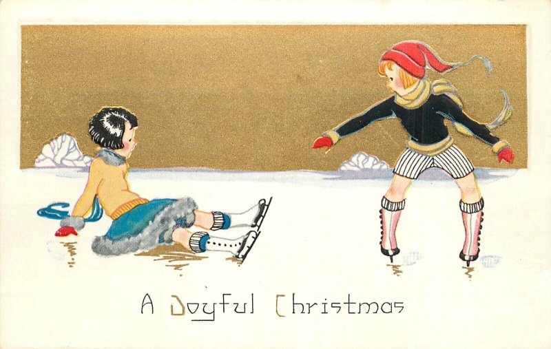 Art Deco Embossed Postcard 82 Christmas Children on Ice Skates Fall Down & Help
