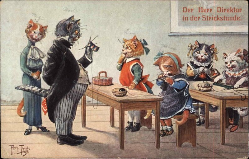 Arthur Thiele 1423 Kitty Cat Fantasy Knitting in Class Classroom c1910 Postcard