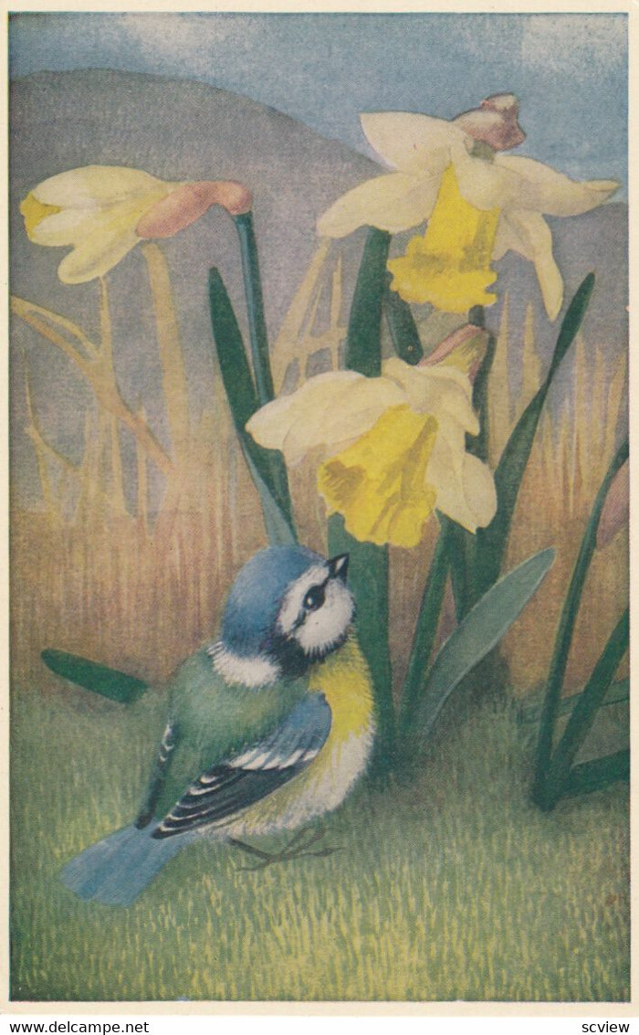 AS: Heda Armour , Bluelit & Daffodils , 1940-50s :: Postcard, 3.5 by 5.5 , Chrome