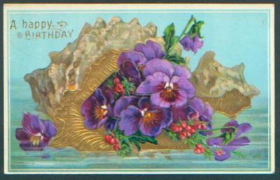 AS550 postcard Birthday pansies shell