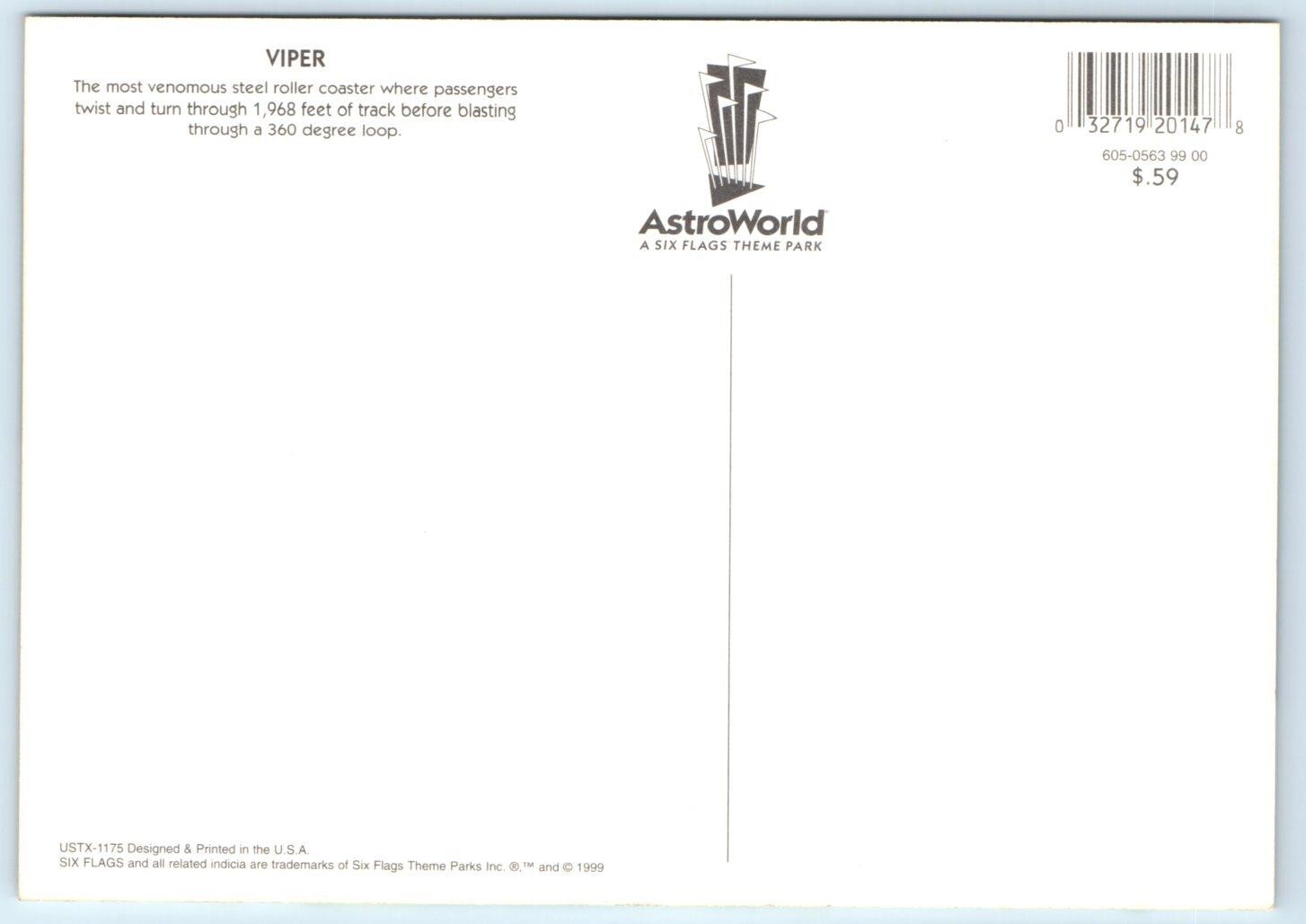 ASTROWORLD, Houston TX ~ Amusement Park VIPER Roller Coaster 5"x7"~1999 Postcard