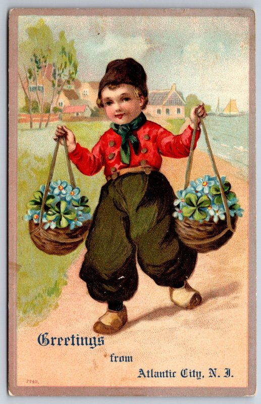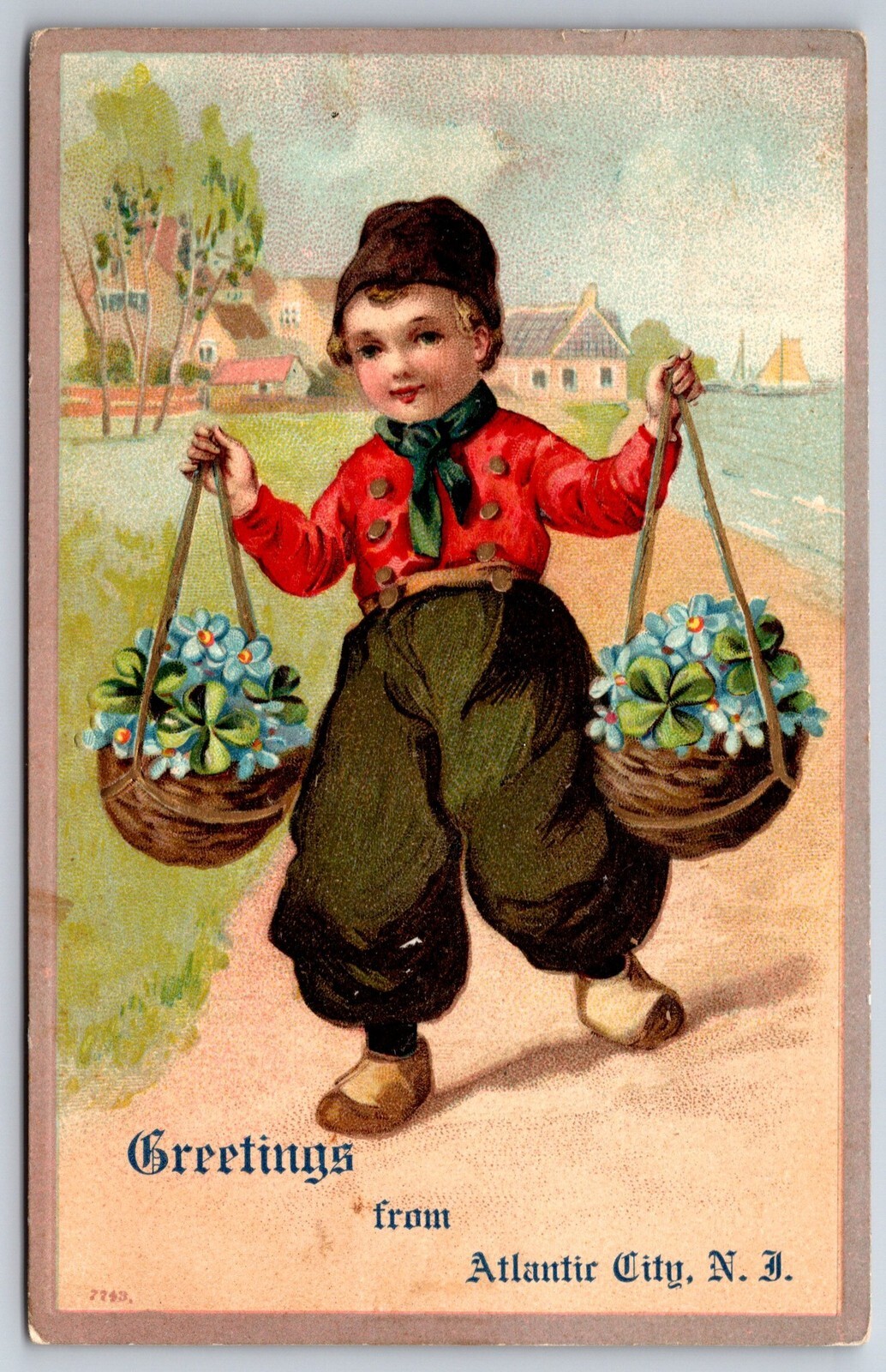 Atlantic City New Jersey Greetings~Dutch Boy with Flower Baskets~1908 Emboss PC