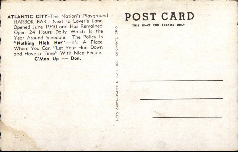 Atlantic City NJ Harbor Bar Don Riddle c1940 Postcard