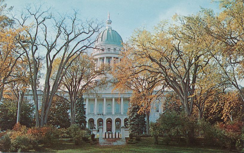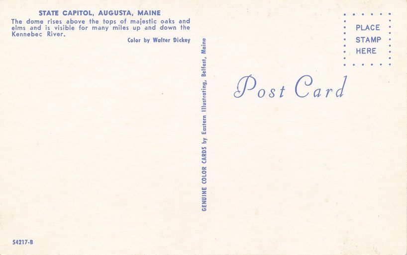Augusta, Maine - State Capitol - Dome above Oak and Elm Trees. Standard sized chrome card. Studio of Eastern Illustrating Publishing Co. Excellent condition.