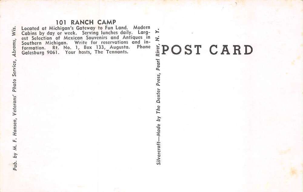 Augusta Michigan 101 Ranch Camp Vintage Postcard AA65418 Good Condition. Please disregard the letter and number in the title. It is for our inventory only. This listing created with GLETech Multiple Selling Channel tools.