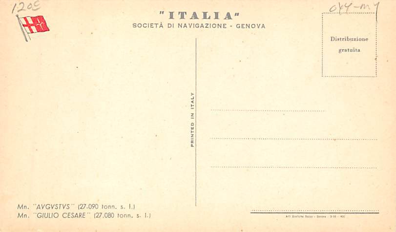 Augustus Italian Line Ship Postcard , Grade: 1 Size: Regular Size Postcard - approximately 3 1/2 inch x 5 1/2 inch (9 CM x 14 CM) Grading Scale: Grade 1 = Perfect corners Grade 2 = Very Minimal corner wear, no ... Read More