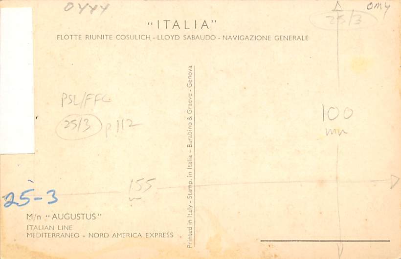 Augustus Italian Line Ship Postcard , Grade: 1 Size: Regular Size Postcard - approximately 3 1/2 inch x 5 1/2 inch (9 CM x 14 CM) Grading Scale: Grade 1 = Perfect corners Grade 2 = Very Minimal corner wear, no ... Read More
