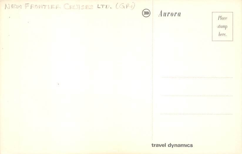 Aurora New Frontier Cruices Ltd. Ship Postcard , Grade: 3 Size: Regular Size Postcard - approximately 3 1/2 inch x 5 1/2 inch (9 CM x 14 CM) Grading Scale: Grade 1 = Perfect corners Grade 2 = Very Minimal corne ... Read More