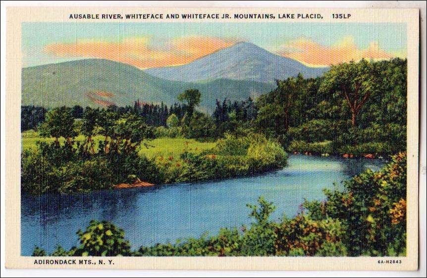 Ausable River, Whiteface Mts. Lake Placid NY UM / EX / Linen Grading of Postcards MINT (M): Perfect condition, no apparent blemishes, flaws, postally unused, may have some writing on back. NEAR MINT (NM): Like ne ... Read More