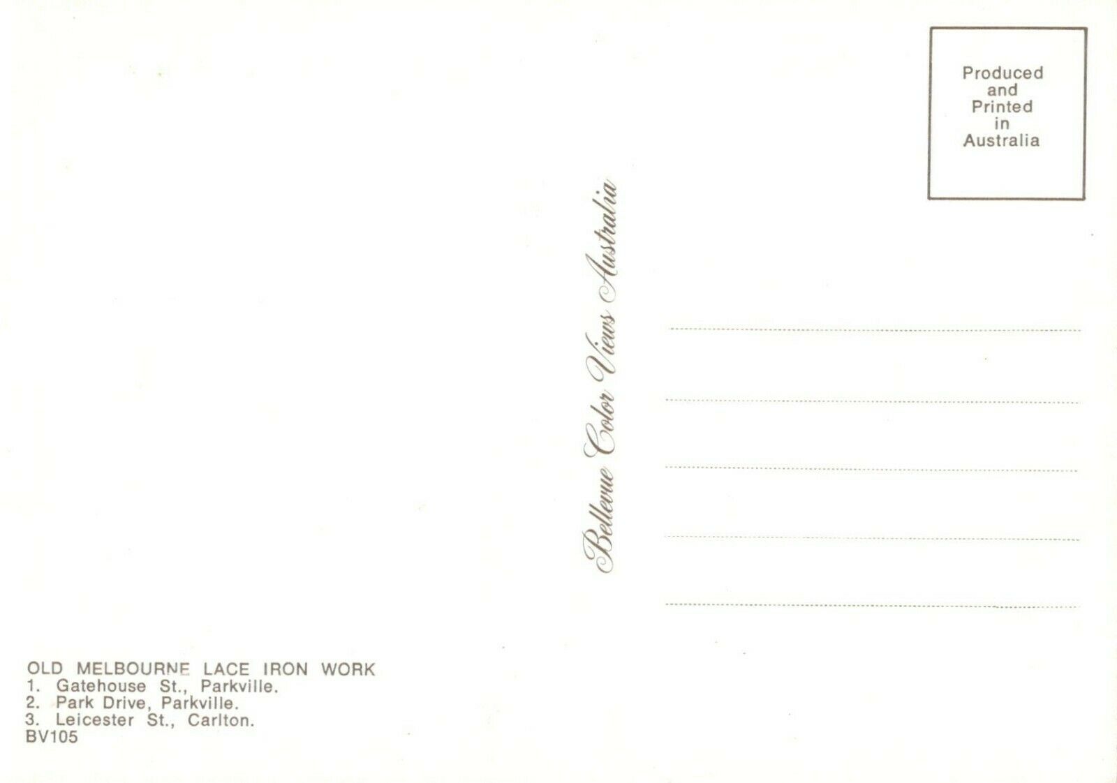 Mo's Postcards Postcard Description: Australia Postcard - Old Melbourne - Lace Iron Work Defect(s): Postage & Payment: For U.K residents the quoted P & P fee is for any number of postcards purchased at one time. Happy to quote for non UK residents. For multiple purchases please wait for an invoice