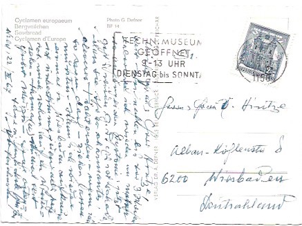 Nice card from Austria - one of my all time favorite places in the world. Here is a great picture of Cyclamen Flowers. Great cancellation and stamp dated 1967 Beautiful, Beautiful Austria.