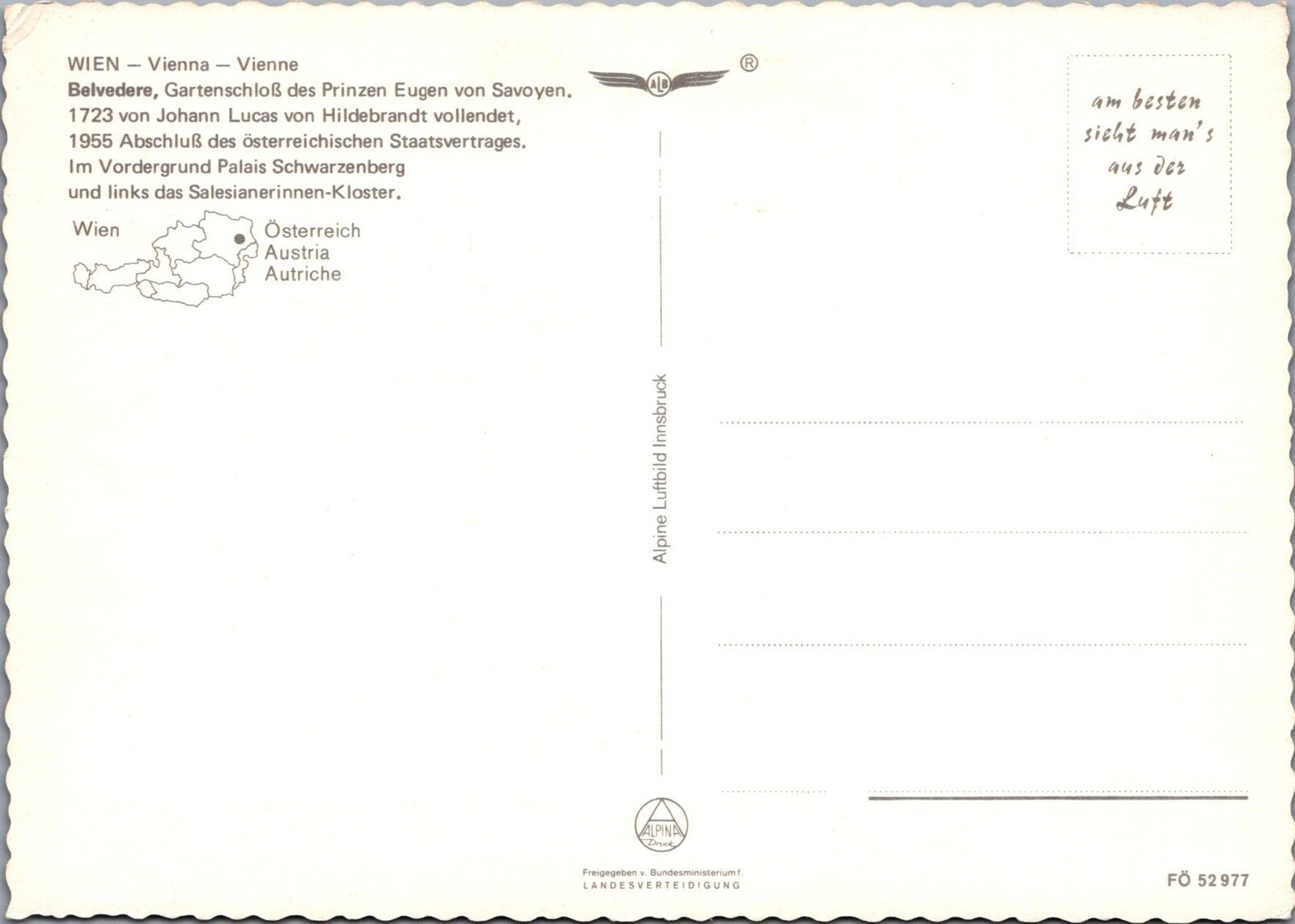 This is an Austria Postcard - Vienna, Schloss Belvedere SW16936 Publisher: Alpine Luftbild Postcard size: Continental. Unused Postcard defect(s): Some rubbing to the top right hand corner Please also use the image magnifier to make your own assessment on the condition. Please ignore any lines caused by the scanner. When possible all of our postcards will be posted to you inside a collectable plastic postcard sleeve and a board backed envelope which will be marked 'Please do not bend'. The 'Mo's Postcards' watermark does not appear on the actual postcard'. Mo's Ref: Austria Postcard - Vienna, Schloss Belvedere SW16936