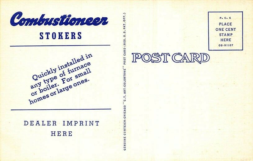 Automatic Coal Heat That's "Combustioneer", Curteich linen advertising postcard.THIS POSTCARD, IS AN ORIGINAL AND NOT A COPY.If you buy more than one item 'buy it now' Please use the 'add to basket' function as this will activate the combined shipping rate.For More Great Postcards, Trade Cards, Covers, etc. Visit our Hip Store: popcornjohn.cominkfrog terapeak