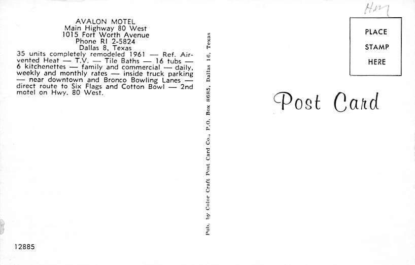 Avalon Motel - Dallas, Texas TX Postcard Grade: 1 Size: Regular Size Postcard - approximately 3 1/2 inch x 5 1/2 inch (9 CM x 14 CM) Grading Scale: Grade 1 = Perfect corners Grade 2 = Very Minimal corner wear, ... Read More
