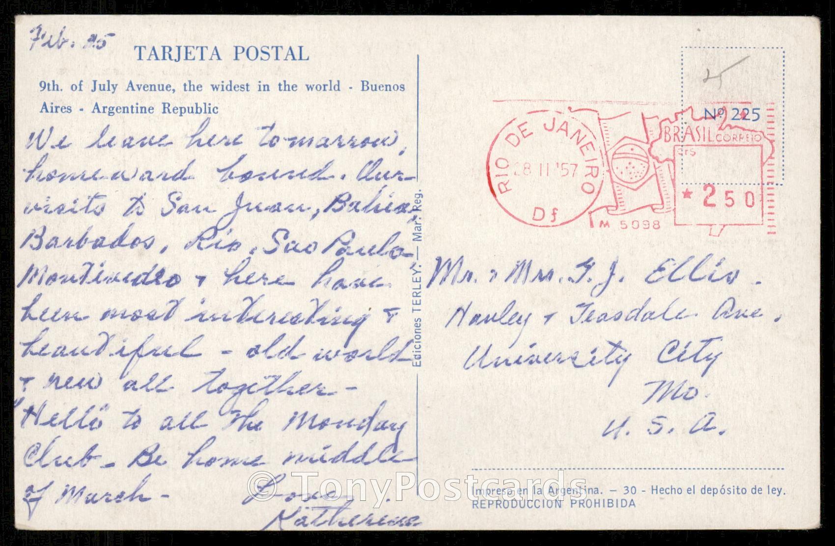 Title: AVENIDA 9 DE JULIO - BUENOS AIRES Condition: See scans Year: 1957 Postmark: Rio De Janeiro 28-II-57 Publisher: Terley Related Categories: America > Argentina