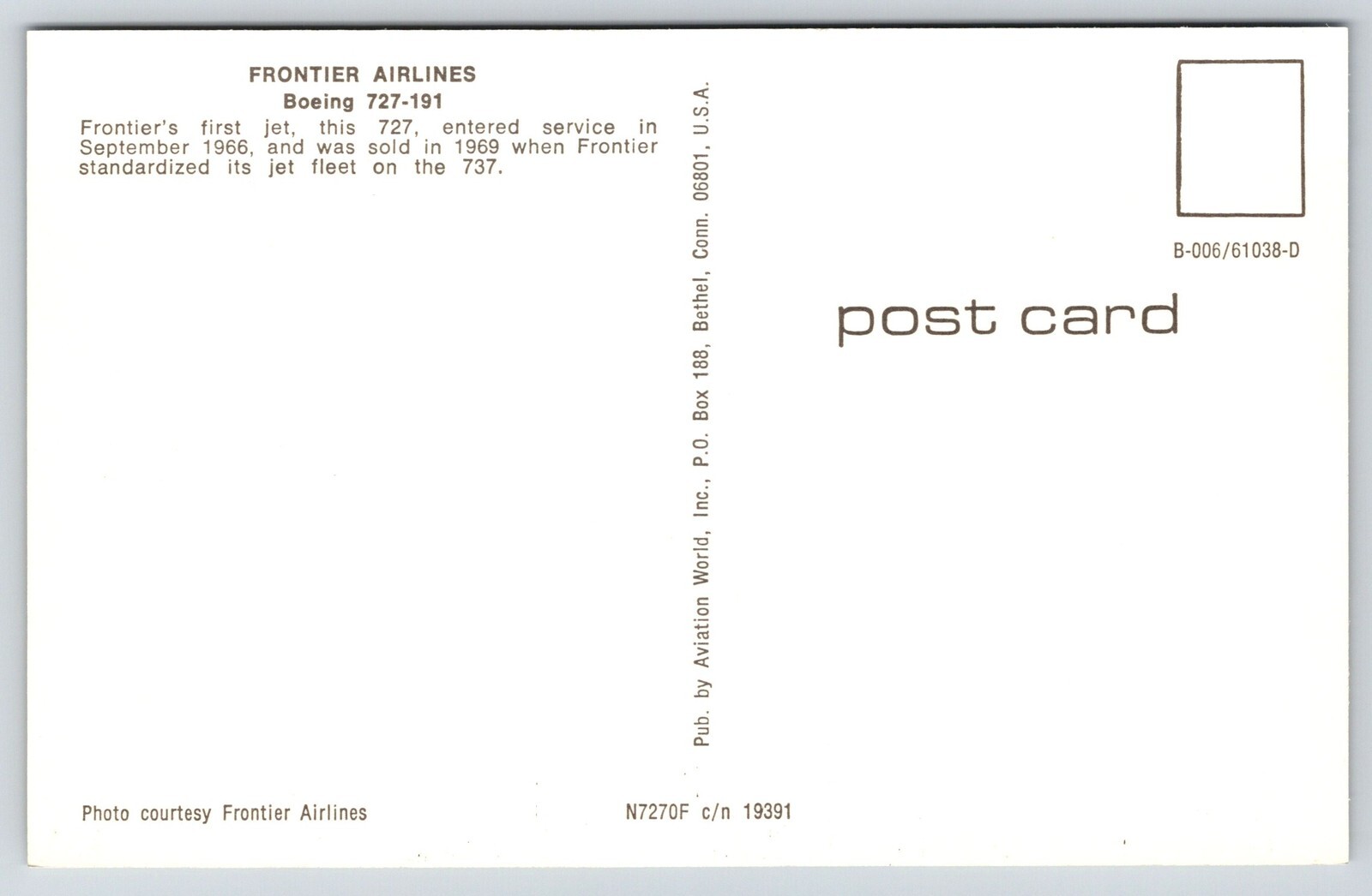 Aviation~Frontier Airlines Boeing 727-191 Jet~Flight Scene~Clouds~1950s Postcard
