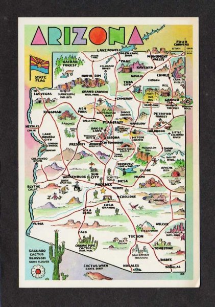 AZ State Map ARIZONA Wickenburg Kingman Tempe Postcard