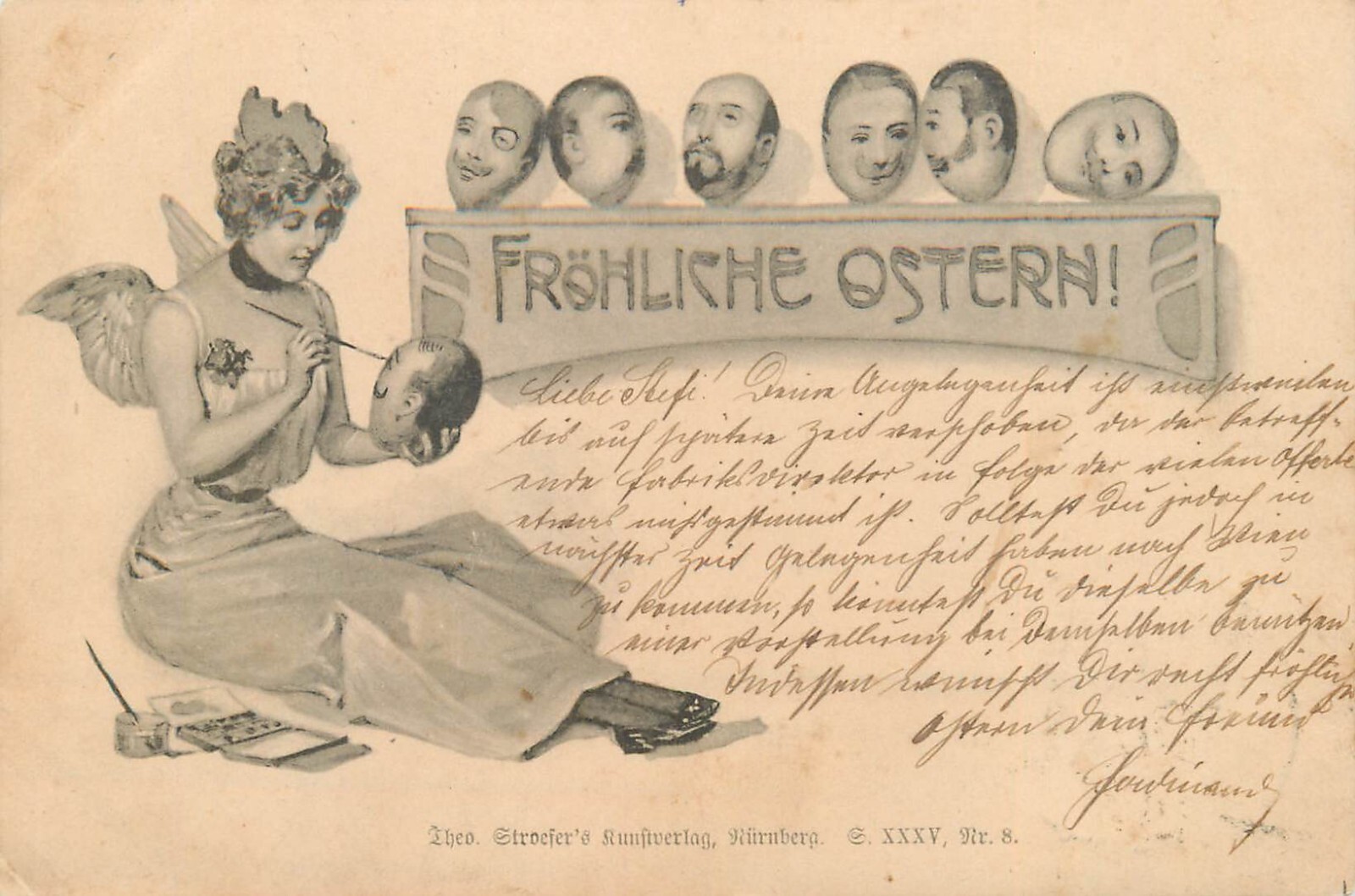 B564 Angel lady pencil men egg head Easter greetings Theo Stroefer postcard 1902