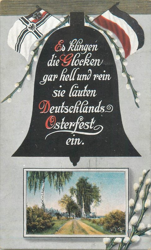 B572 Germany Easter greetings postcard landscape bell silhouette and flags 1915