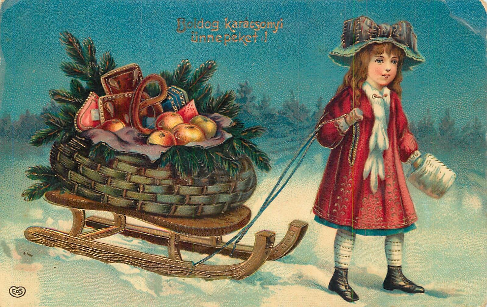 B582 Christmas greetings postcard girl pulling sledge apples & gingerbread 1923
