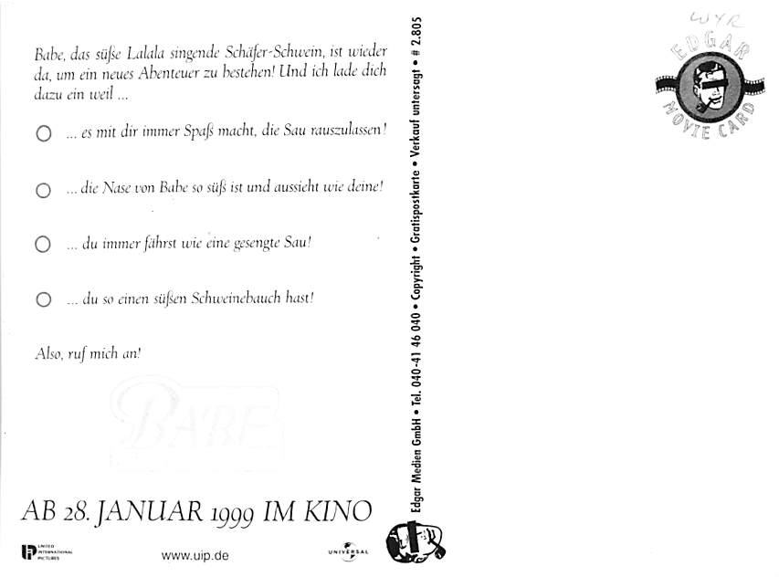 Babe - Pig, Movie Grade: 1 - 3D card Category: Continental Size Postcard, Approx 4 in x 6 in (10 cm x 15.25 cm) Product Size: Continental size: 4X6 inches (10.5 cm x 15 cm) Grading Scale: Grade 1 = Perfect corn ... Read More
