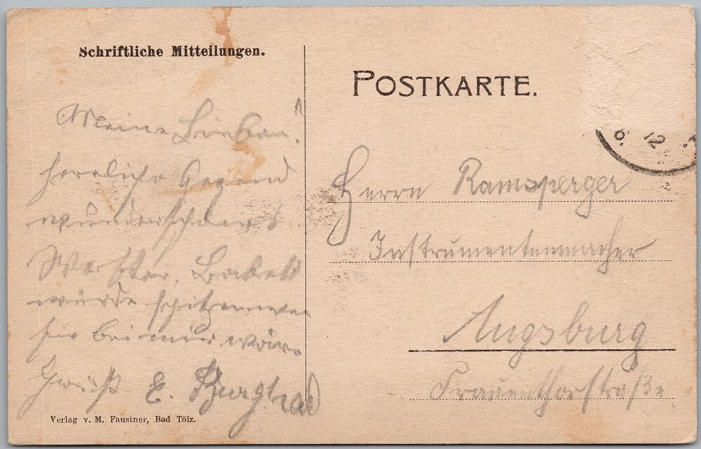 This vintage lithograph postcard features a panoramic view of Bad Tölz, a picturesque town located in Bavaria, Germany. The image captures the serene river winding through the town with charming historic buildings on both banks, framed by rolling hills and distant mountains. The postcard showcases early 20th century European townscape aesthetics with detailed printing techniques typical of lithographic postcards from that era.Published by Verlag v. M. Faustner, Bad Tölz, this original postcard is a beautiful example of early printed paper memorabilia. The back of the card includes handwritten German script and a partial postmark, indicating it was once mailed, adding to its collectible authenticity. Perfect for collectors of European travel memorabilia, German postcards, or vintage lithograph prints, this piece offers historical and geographical significance from the heart of Bavaria.This card sold as is due to some creasing and paper weakness in the top left region, some creasing in the top right corner region and a very tiny tear at the top right edge. Please zoom into and look closely at the front and back photos to view condition and feel free to send me a message if you have any questions. Thanks kindly for viewing, D