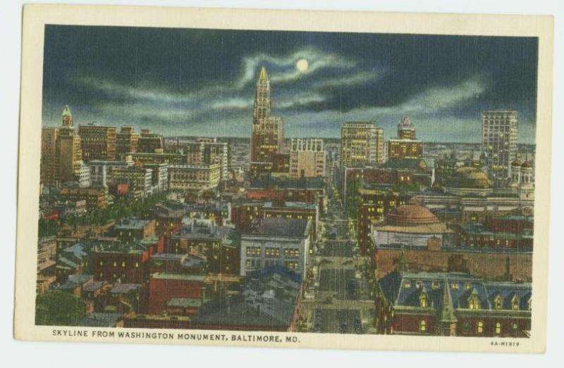 BALTIMORE MD SKYLINE @ NITE 1934 LOVELY LINEN POSTCARD