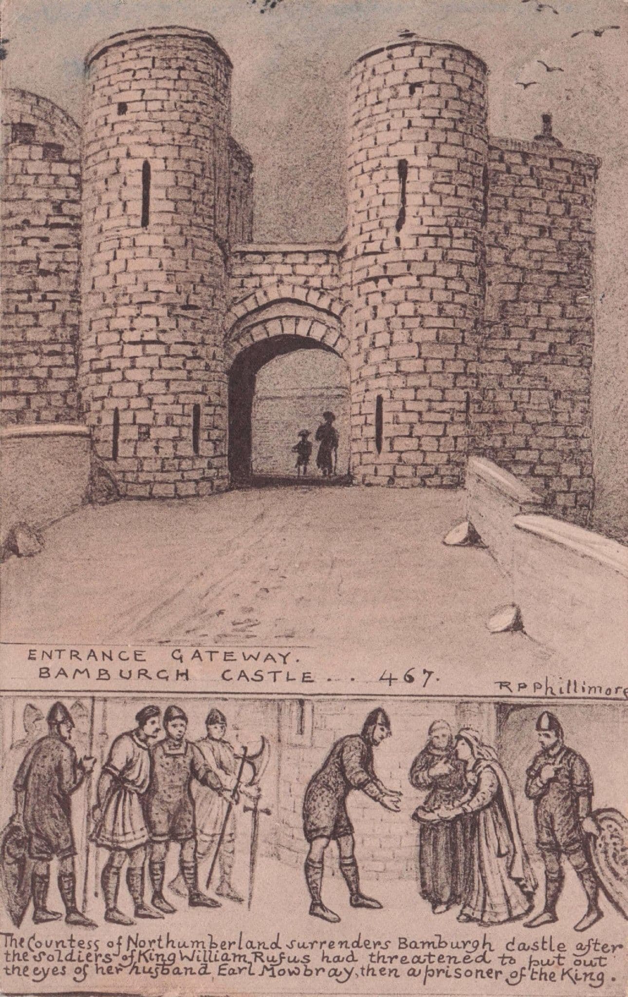Bamburgh Castle Gateway Eye Gouging Battle Countess Phillimore Old Postcard